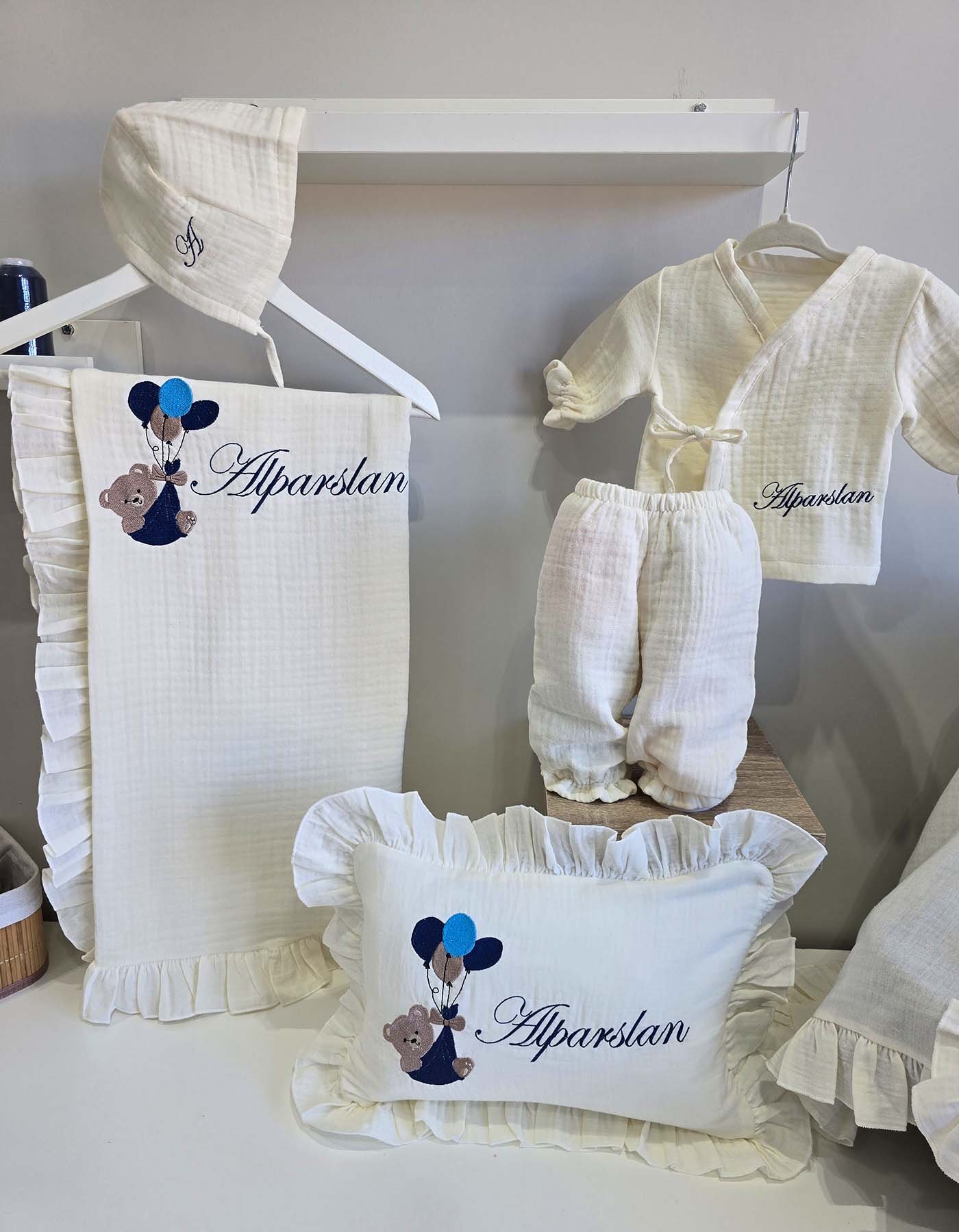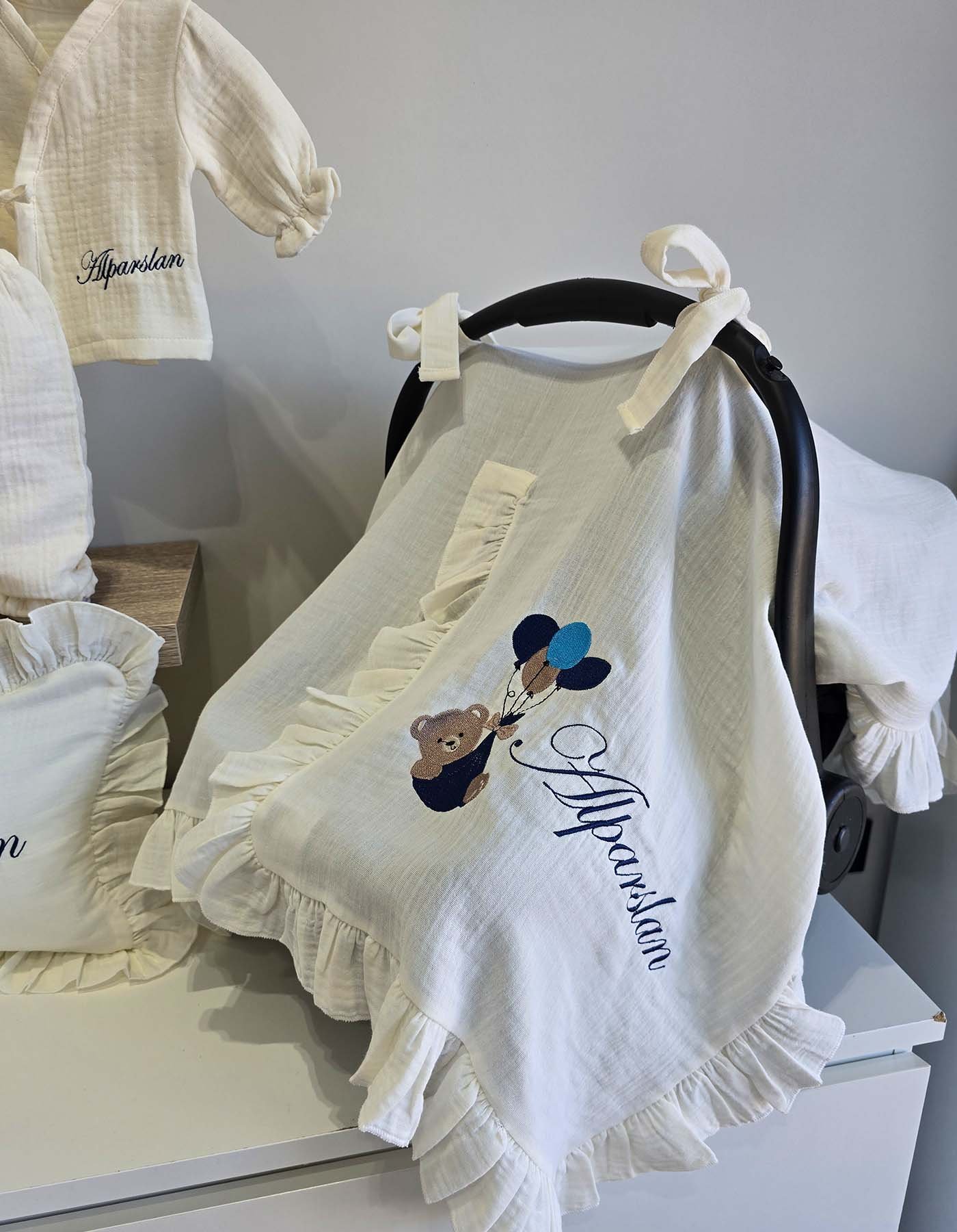 Set İçeriği : Kruvaze Yaka Takım · Şapka · Fırfırlı Battaniye · Fırfırlı Dolgulu Yastık · Fırfırlı Puset Örtüsü