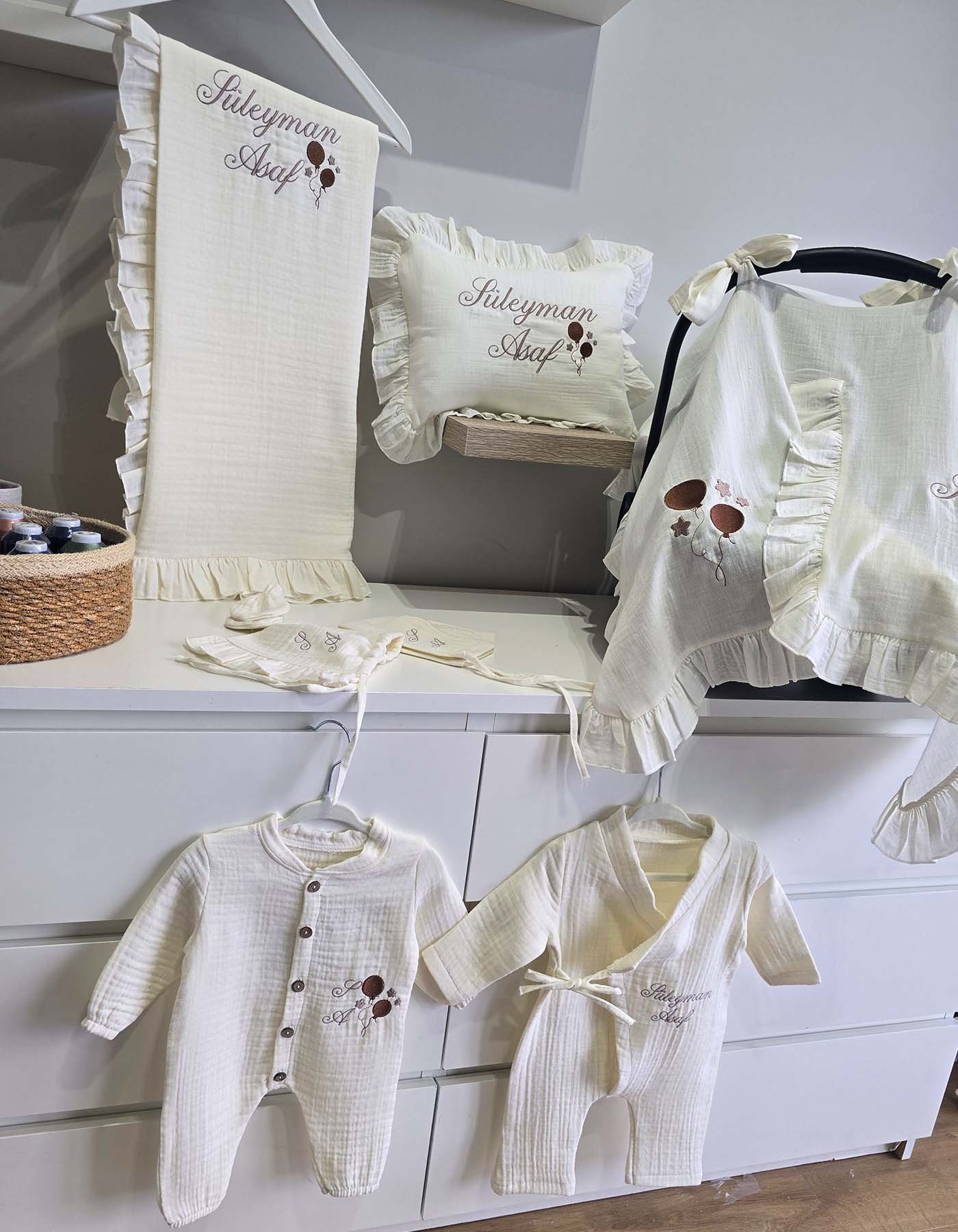 Zarif tasarımı ve kişiye özel nakış detayları ile hem şık hem de kullanışlı bir hastane çıkış seti olarak hazırlanmıştır. Günlük kullanım, hastane çıkışı ve özel anlar için ideal bir settir.