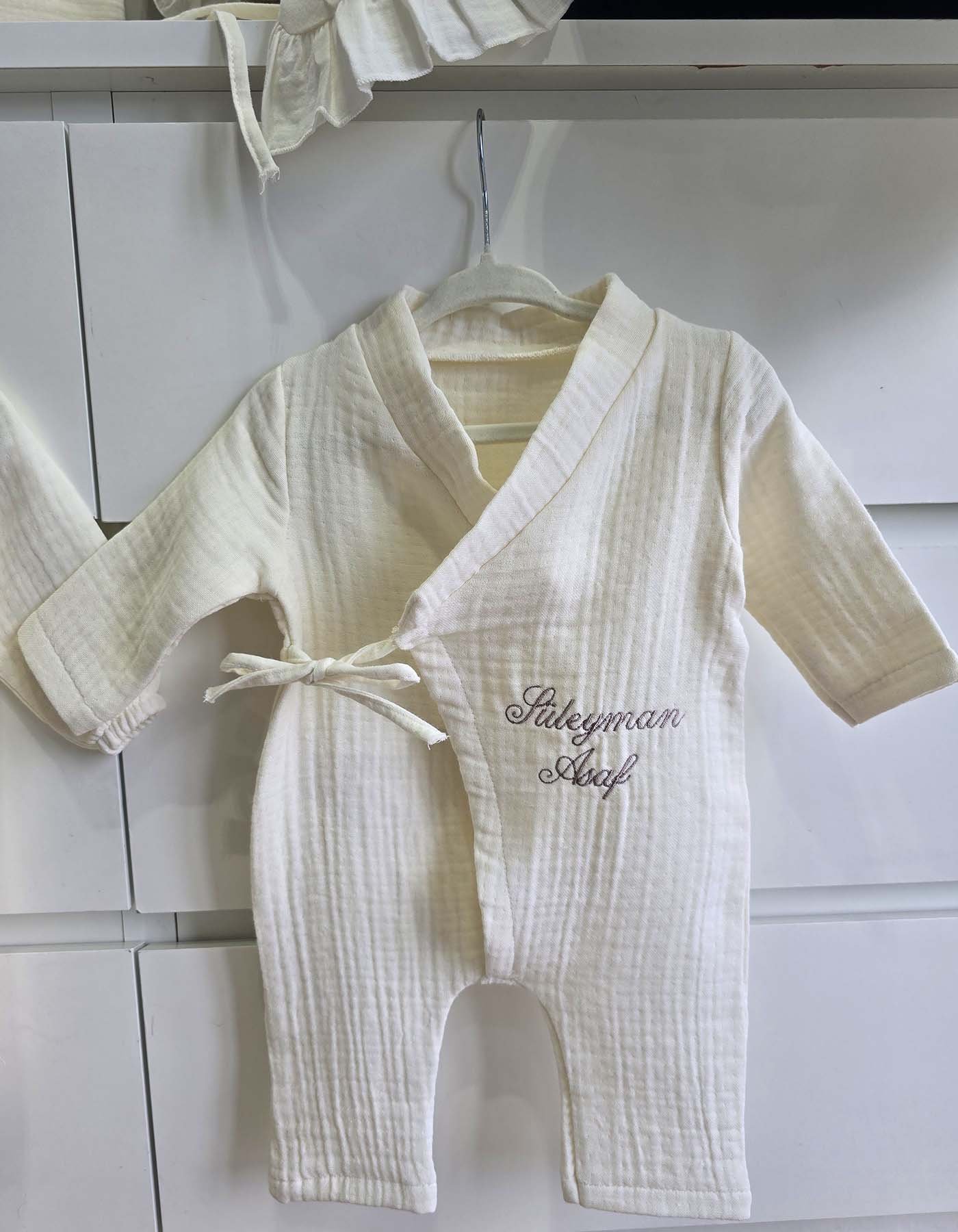 Yenidoğan bebekler için tasarlanan Düz Kruvaze Yaka Müslin Bebek Hastane Çıkış Seti, %100 pamuk müslin kumaştan üretilmiştir. Nefes alabilen doğal yapısı sayesinde bebeklerin hassas cildi ile uyumludur.